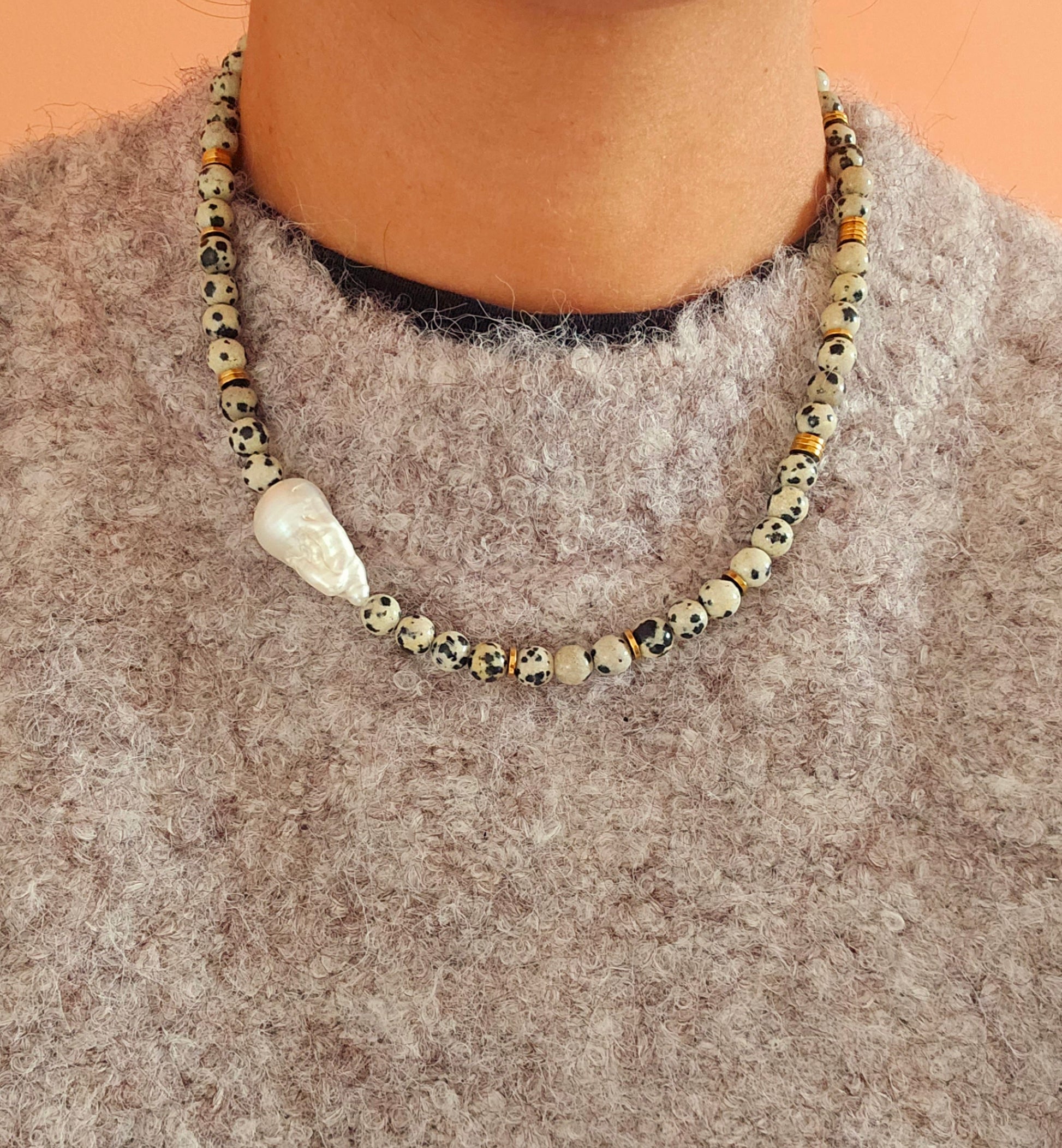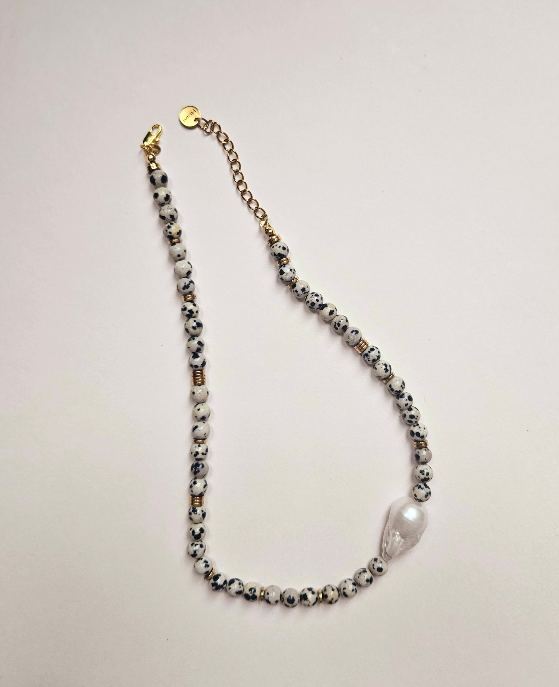 Dalmation jasper stone beads with a baroque pearl and gold filled spacer discs.
