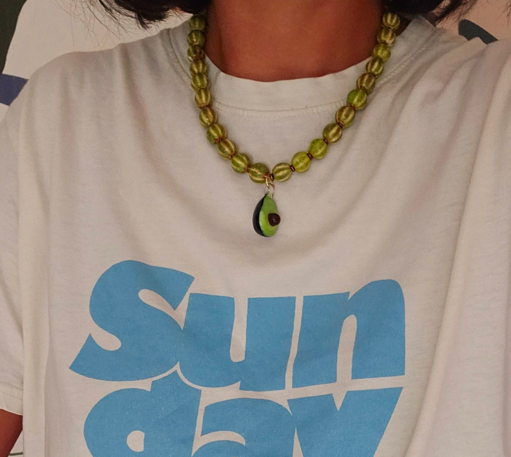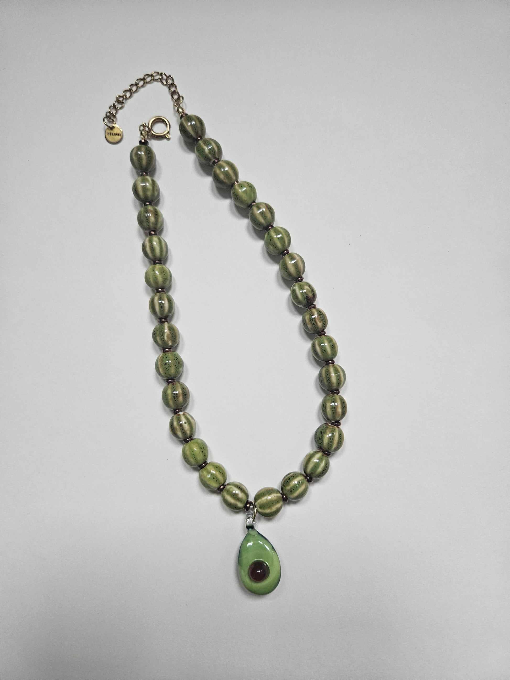 Vintage green ceramic beads, hematite with a glass avocado pendant.