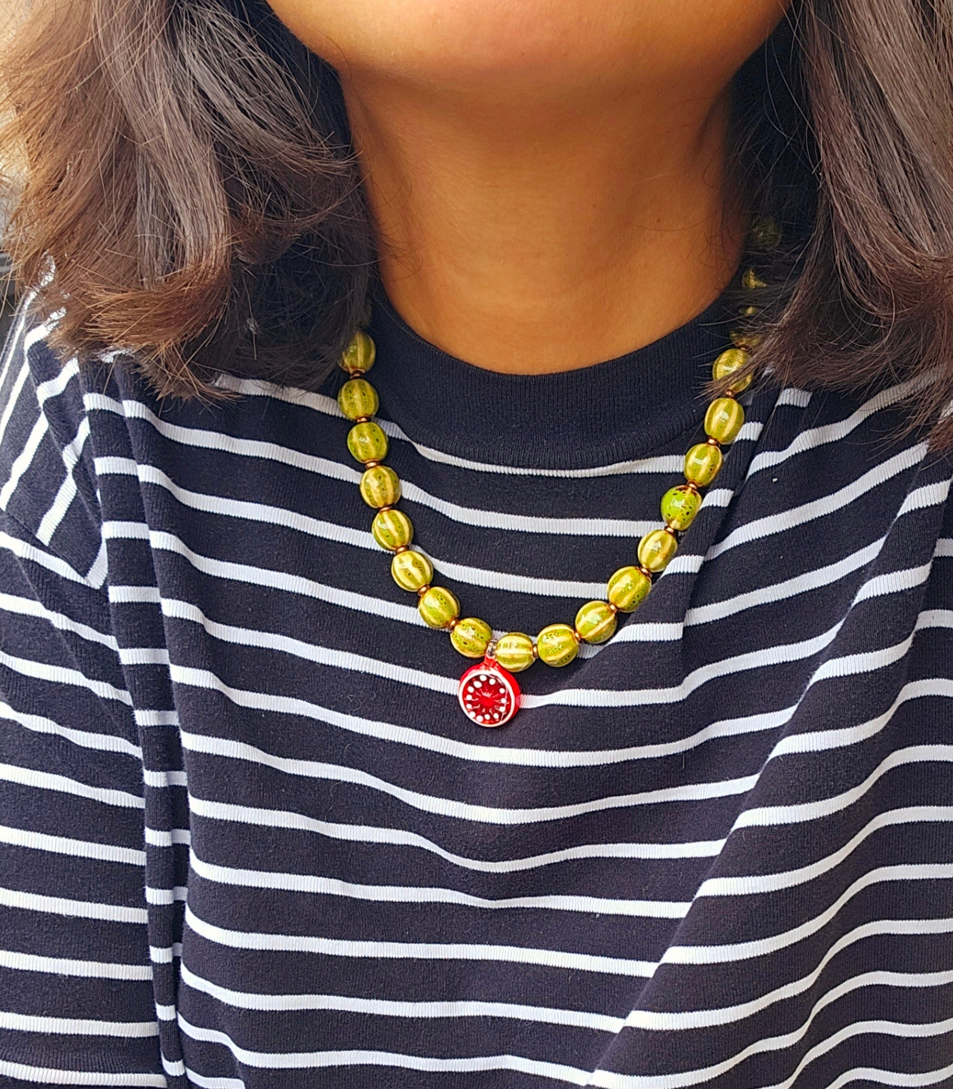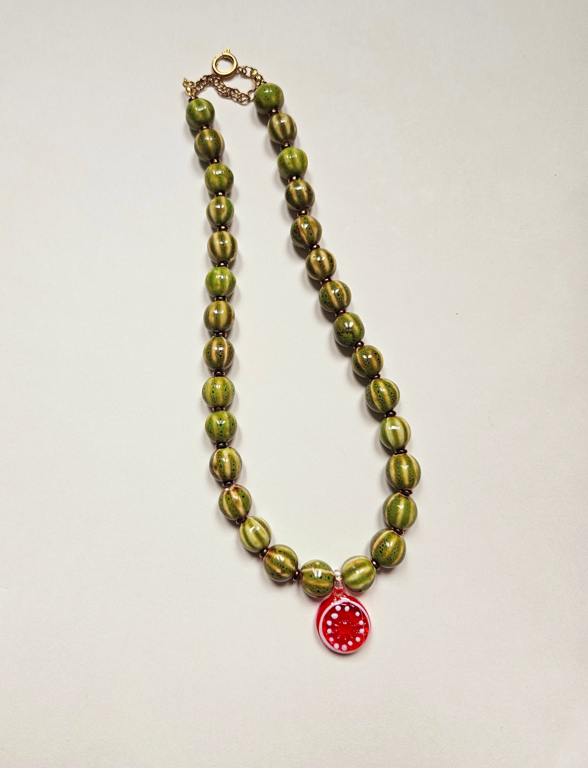 Vintage green ceramic beads paired with a glass blood orange pendant.