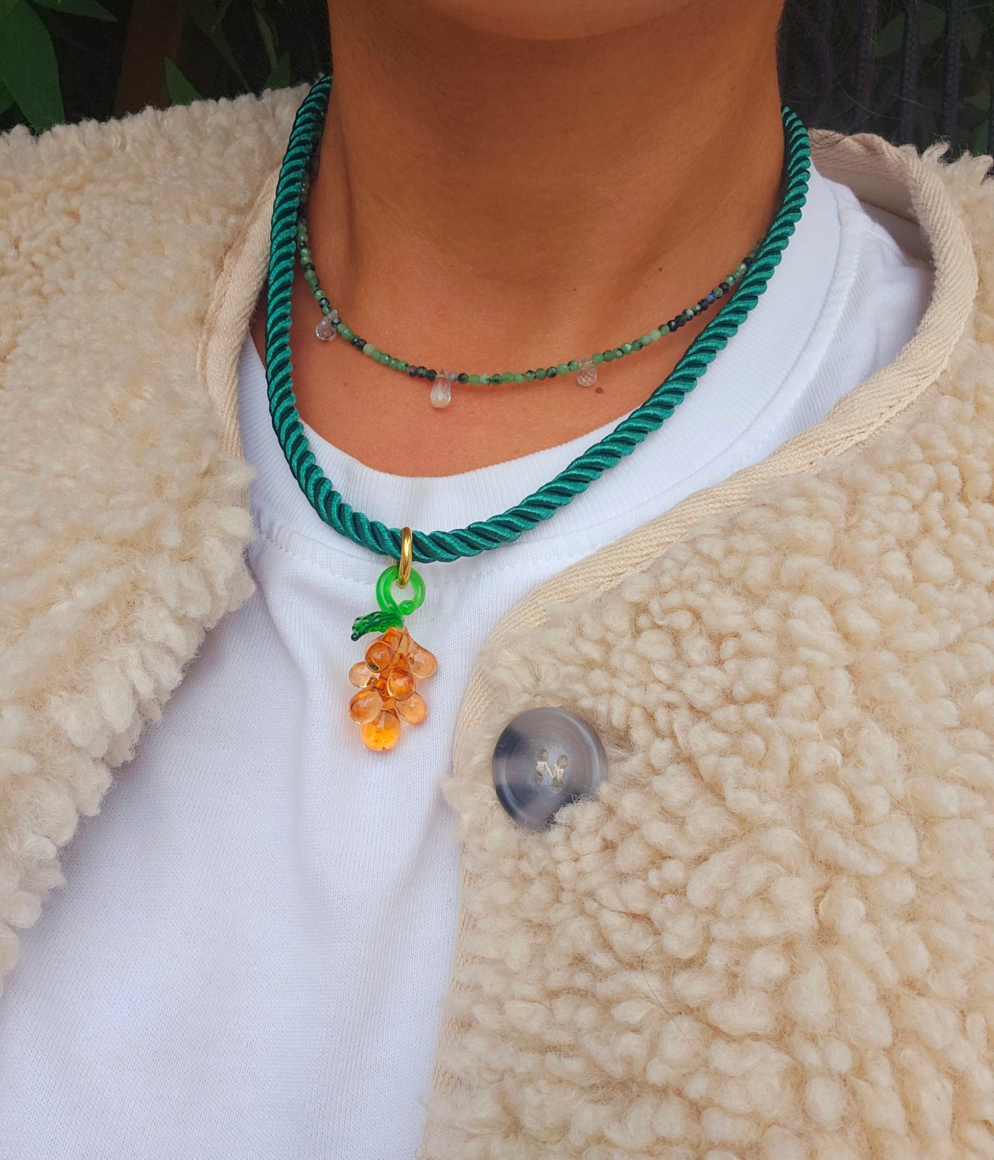 Green silk rope with a chamagne grape glass pendant.