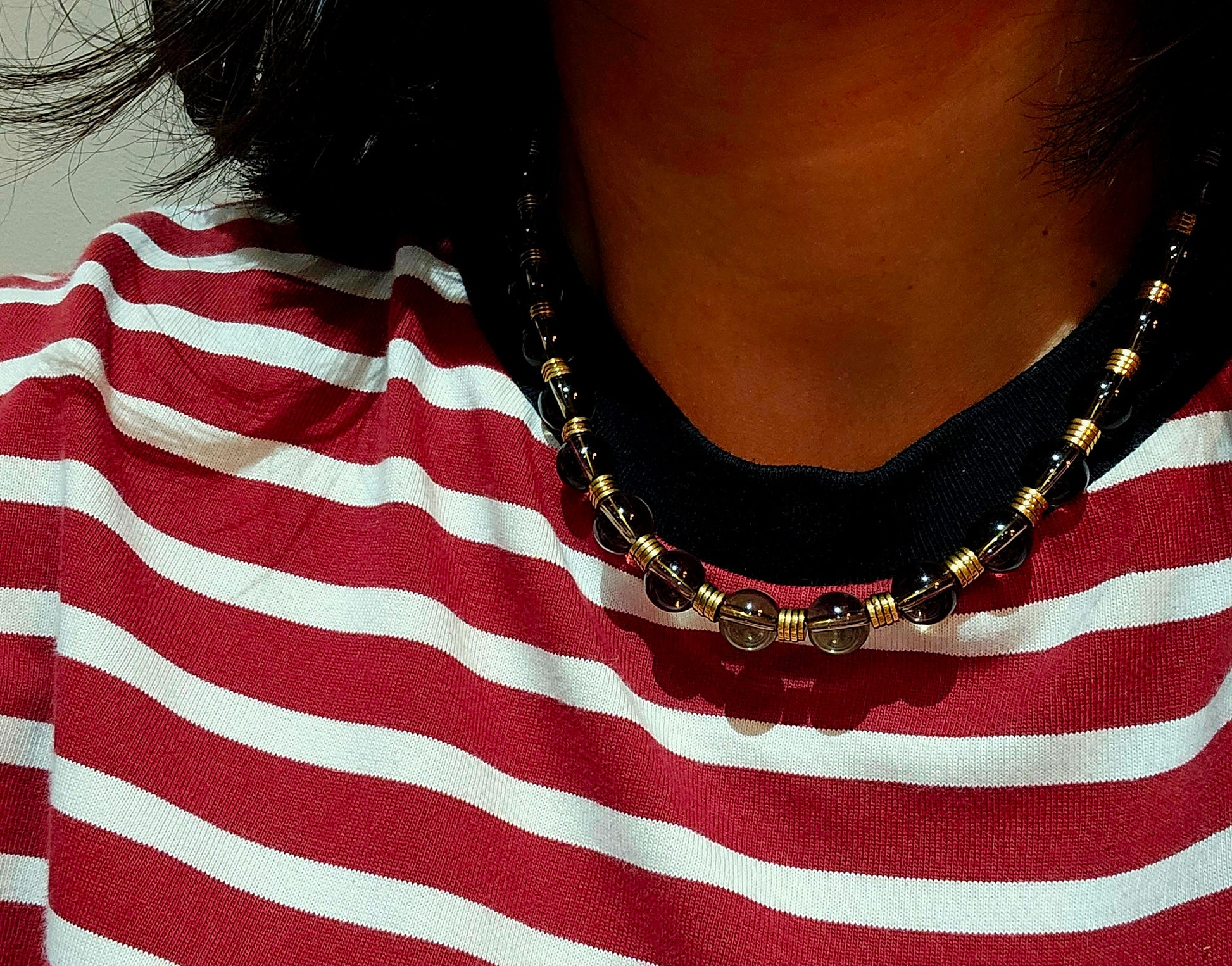Smokey quartz beads and gold filled discs. Comes with a 15mm extender.