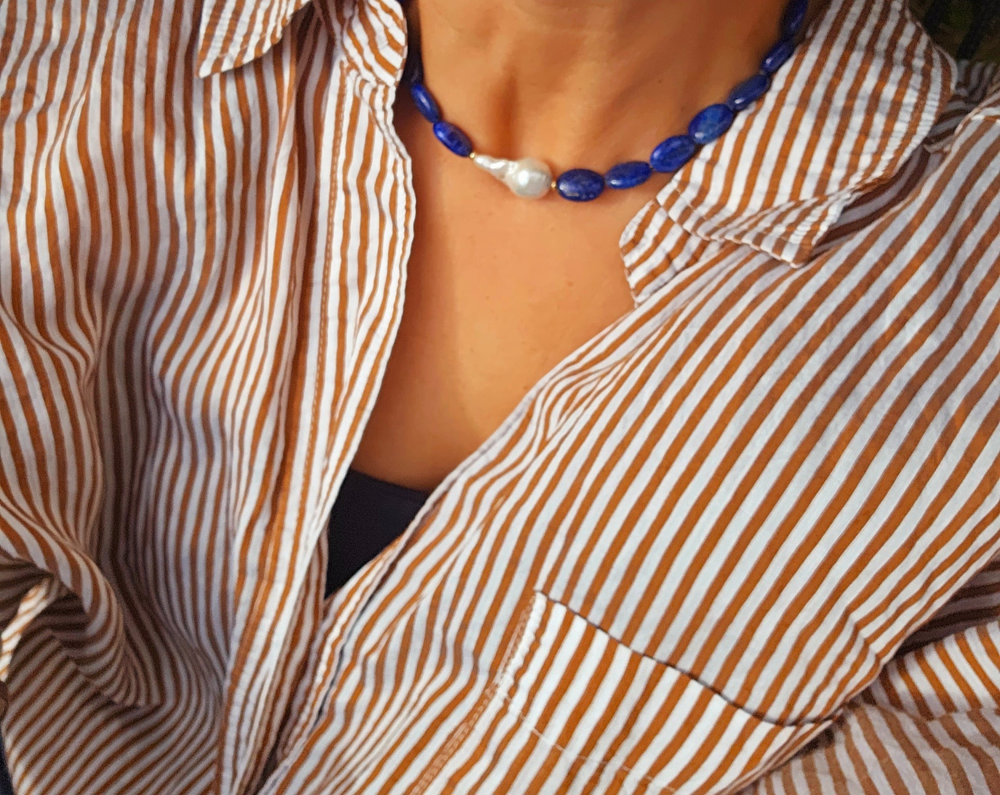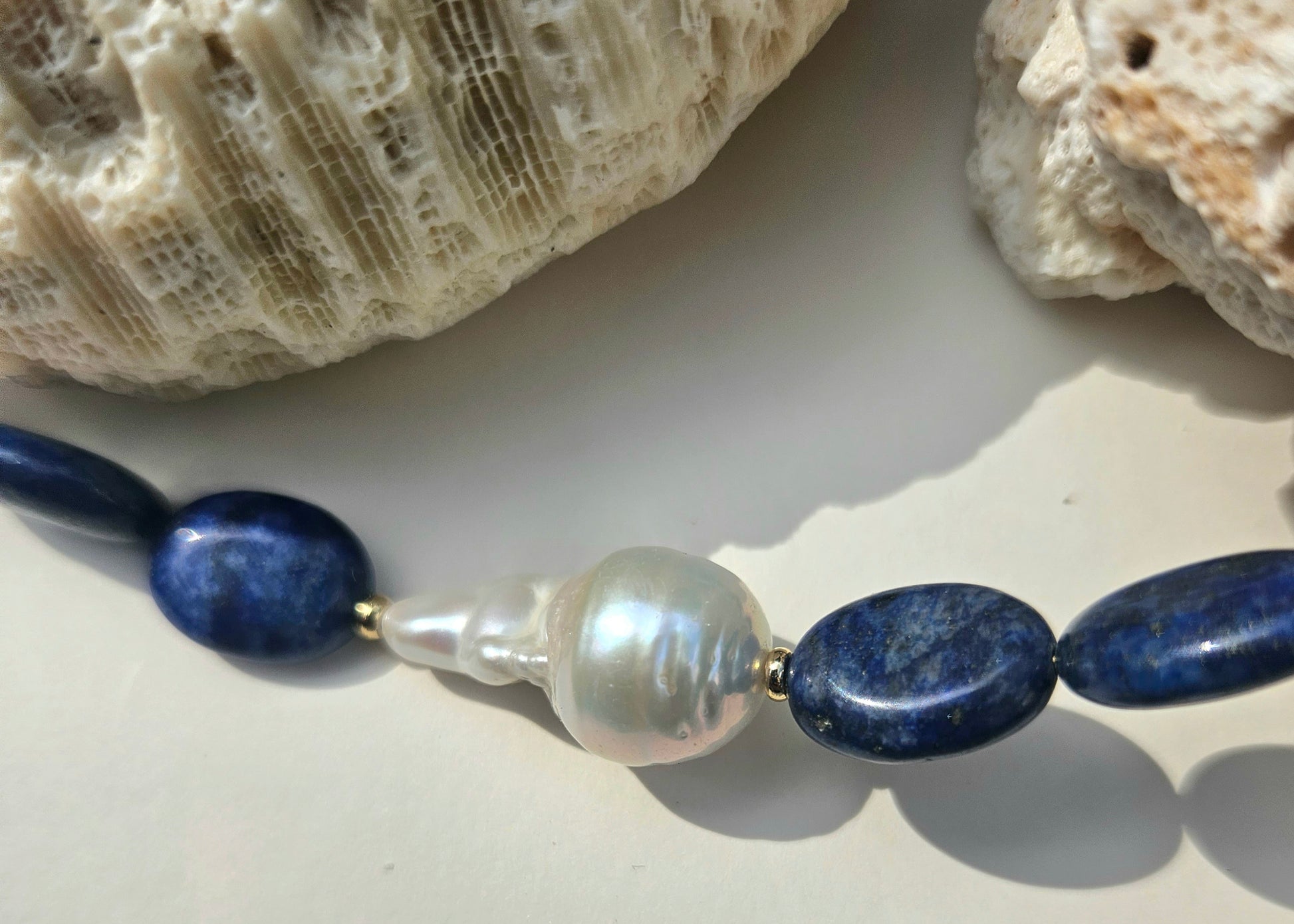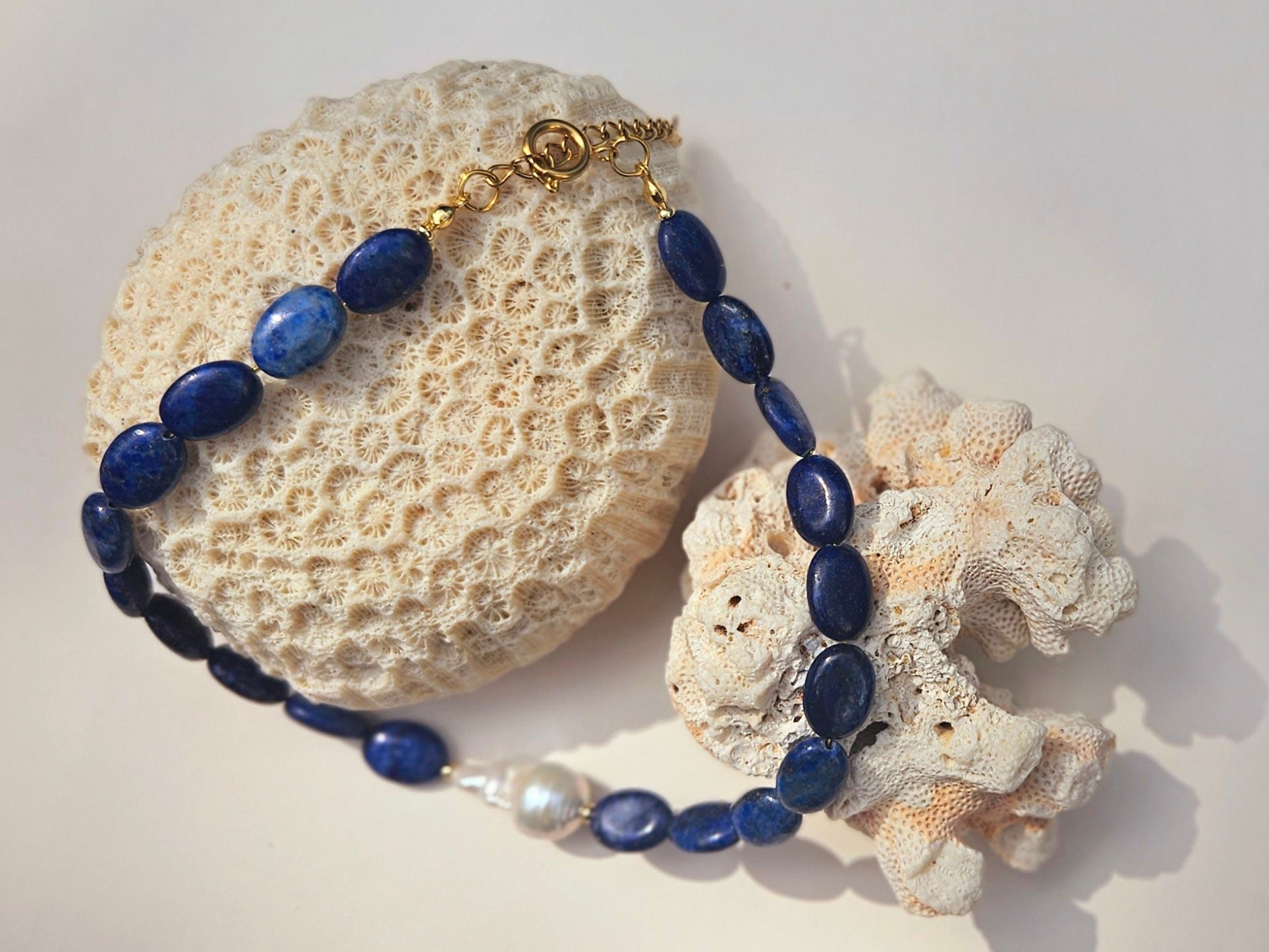 Lapiz stones, baroque pearl, gold spacer beads and gold filled hardware. The necklace has 5 cm extender so can be worn as a chocker or a bit longer.