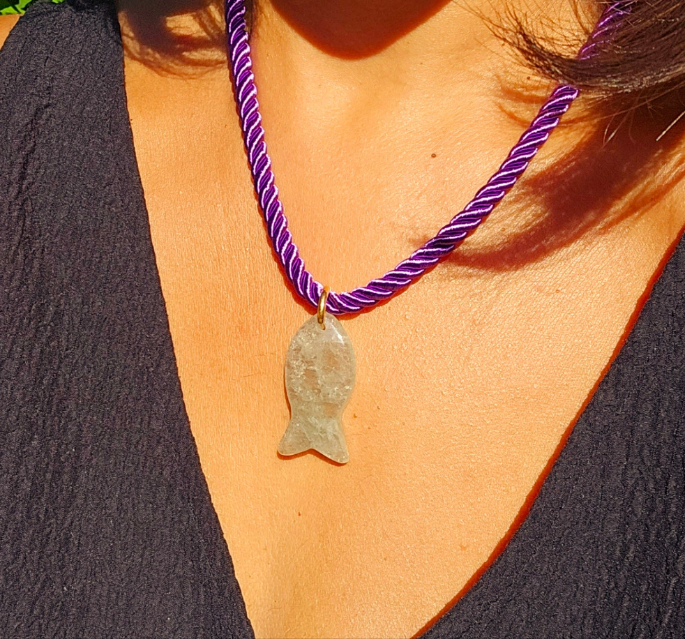 Silk purple rope necklace with natural green aventurine fish pendant.