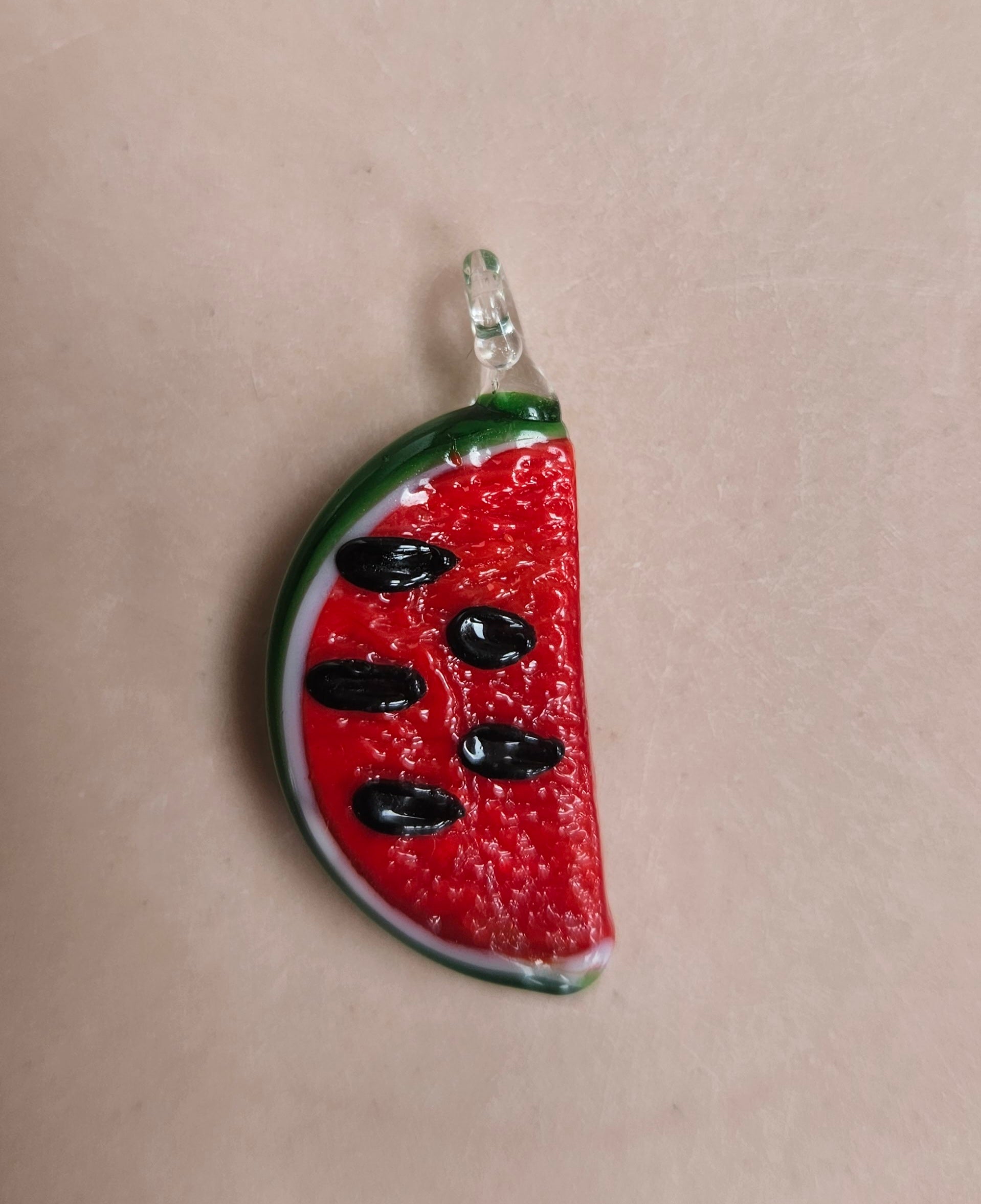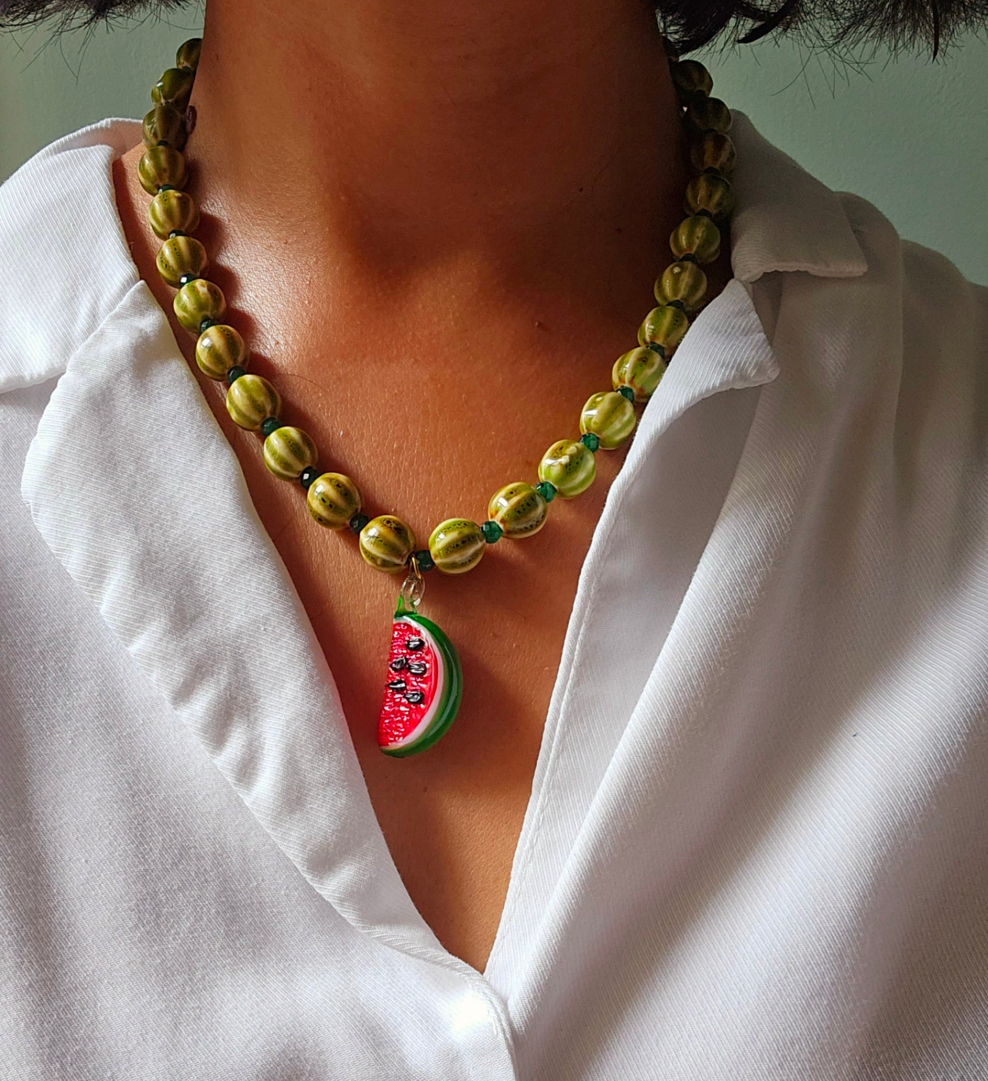 Vintage green ceramic beads with green crystal spacer beads. Watermelon glass pendant.