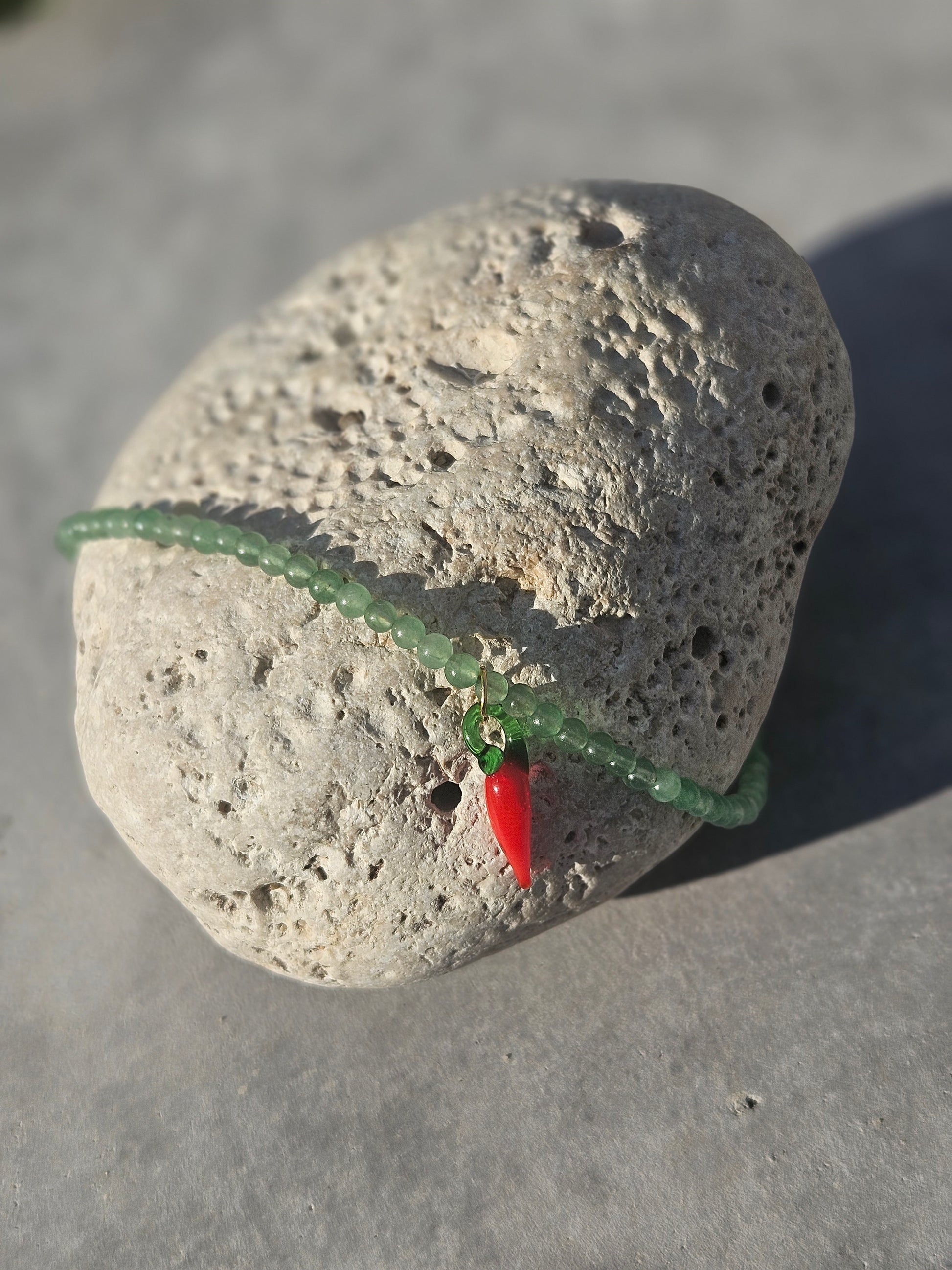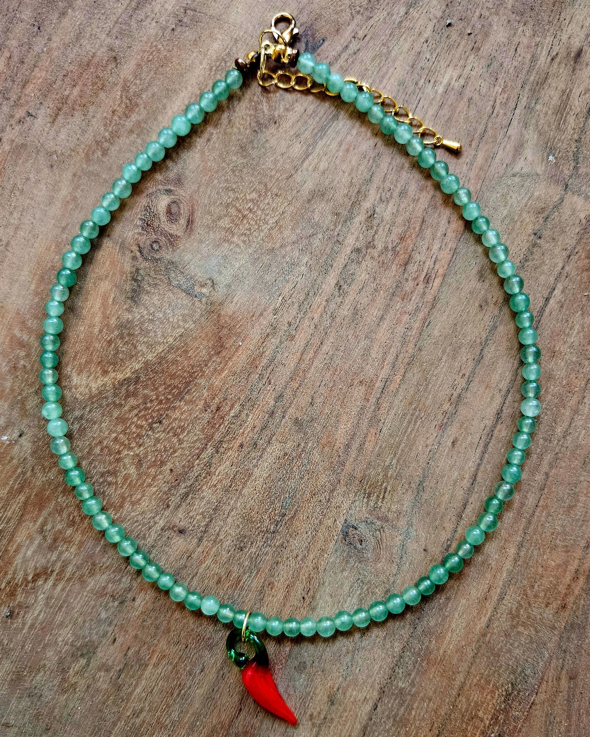 Green aventurine beads with a chilli glass pendant.