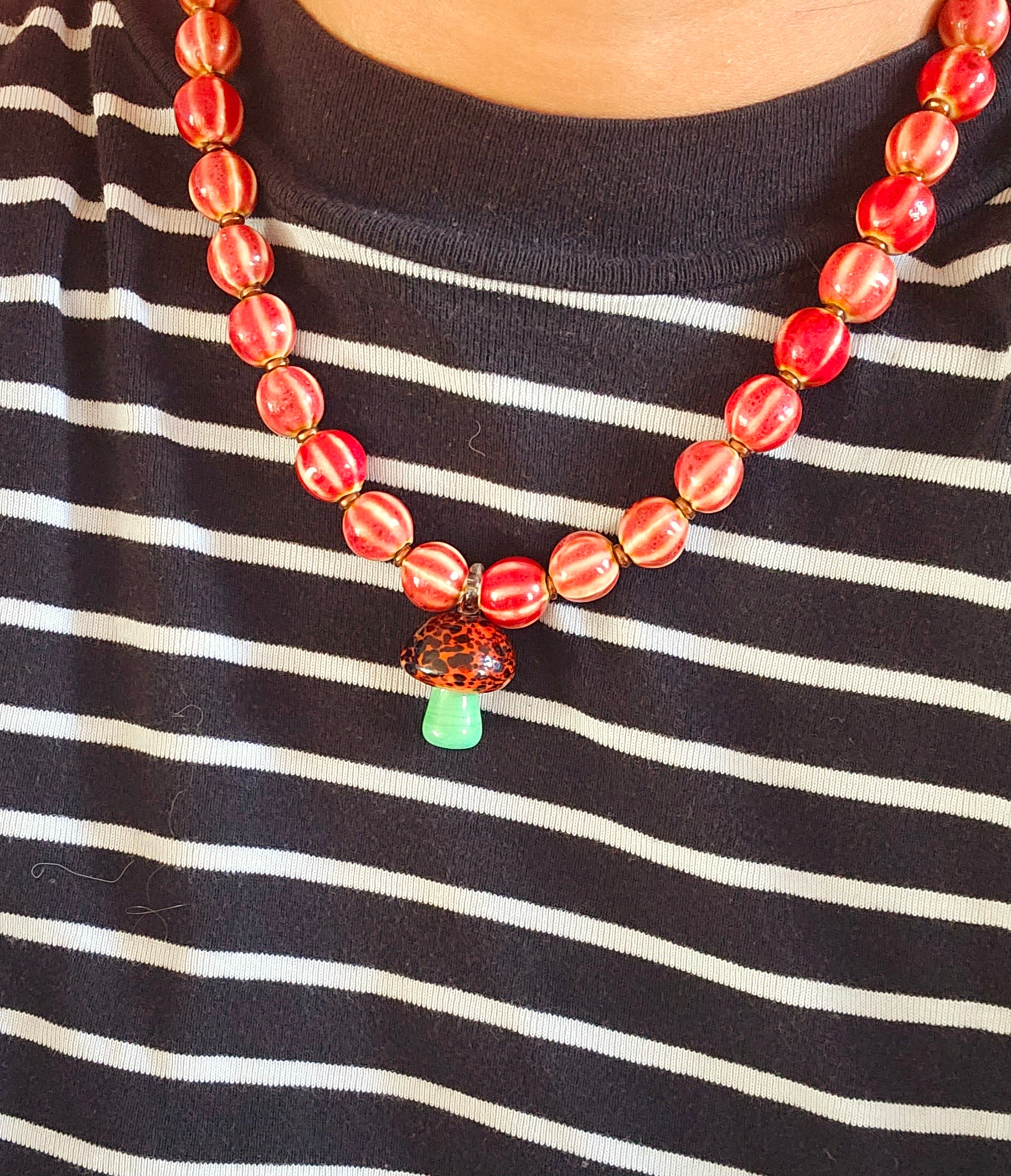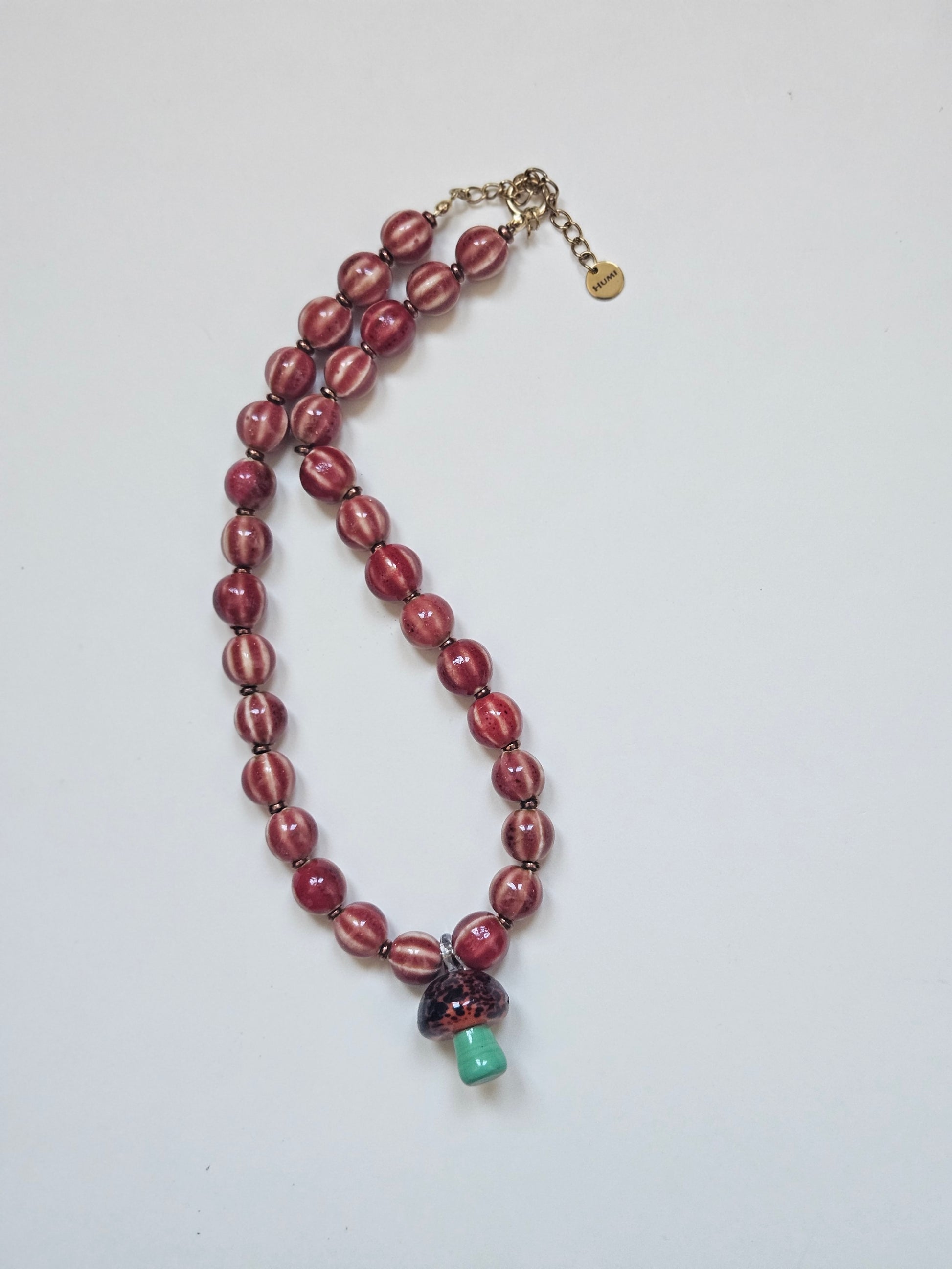 Vintage red ceramic beads with a green/brown mushroom glass pendant.