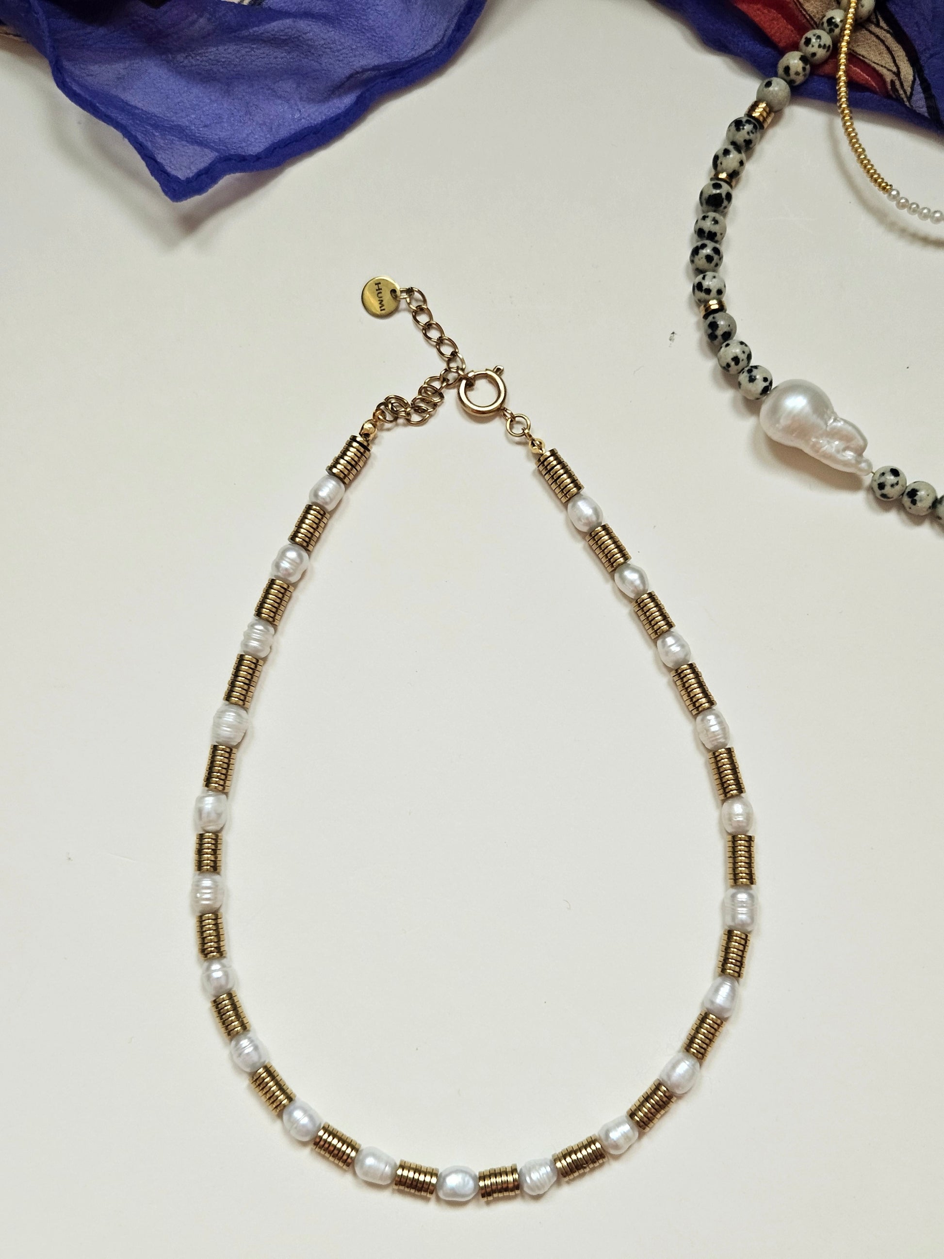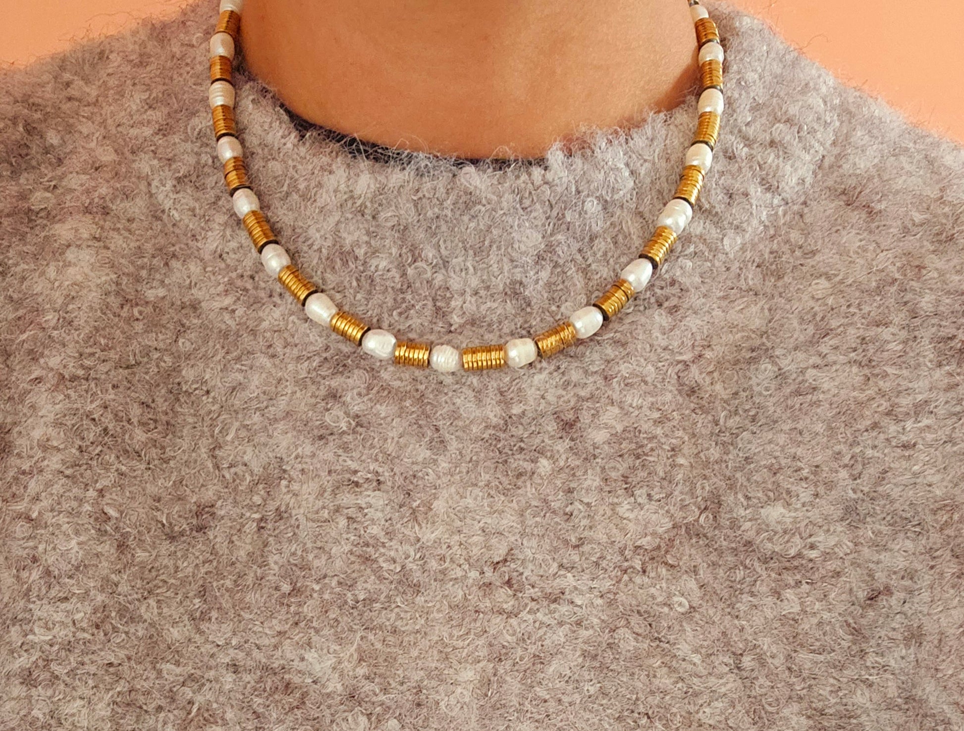 20 pearls with gold filled spacer discs. She literally goes with everything!