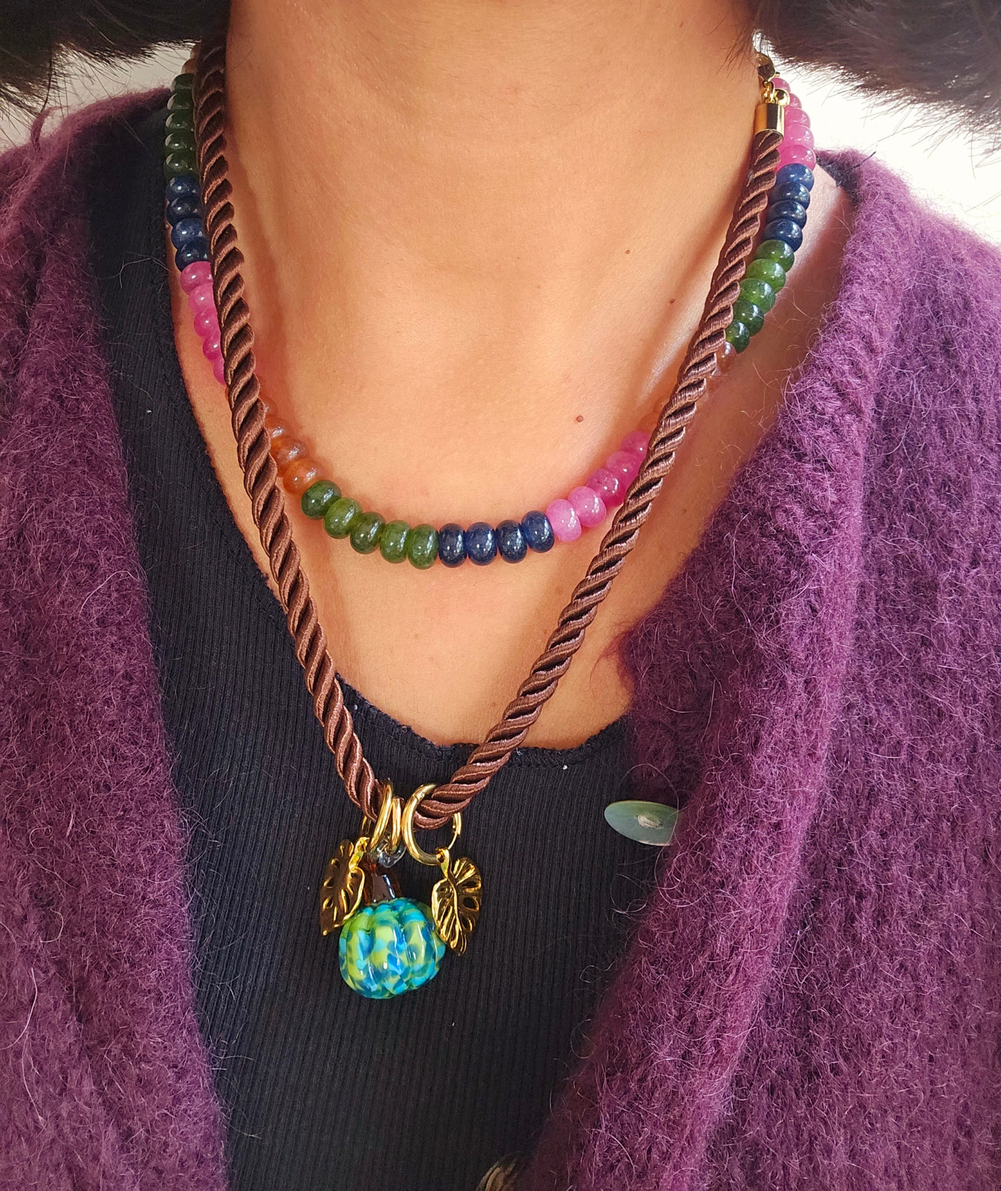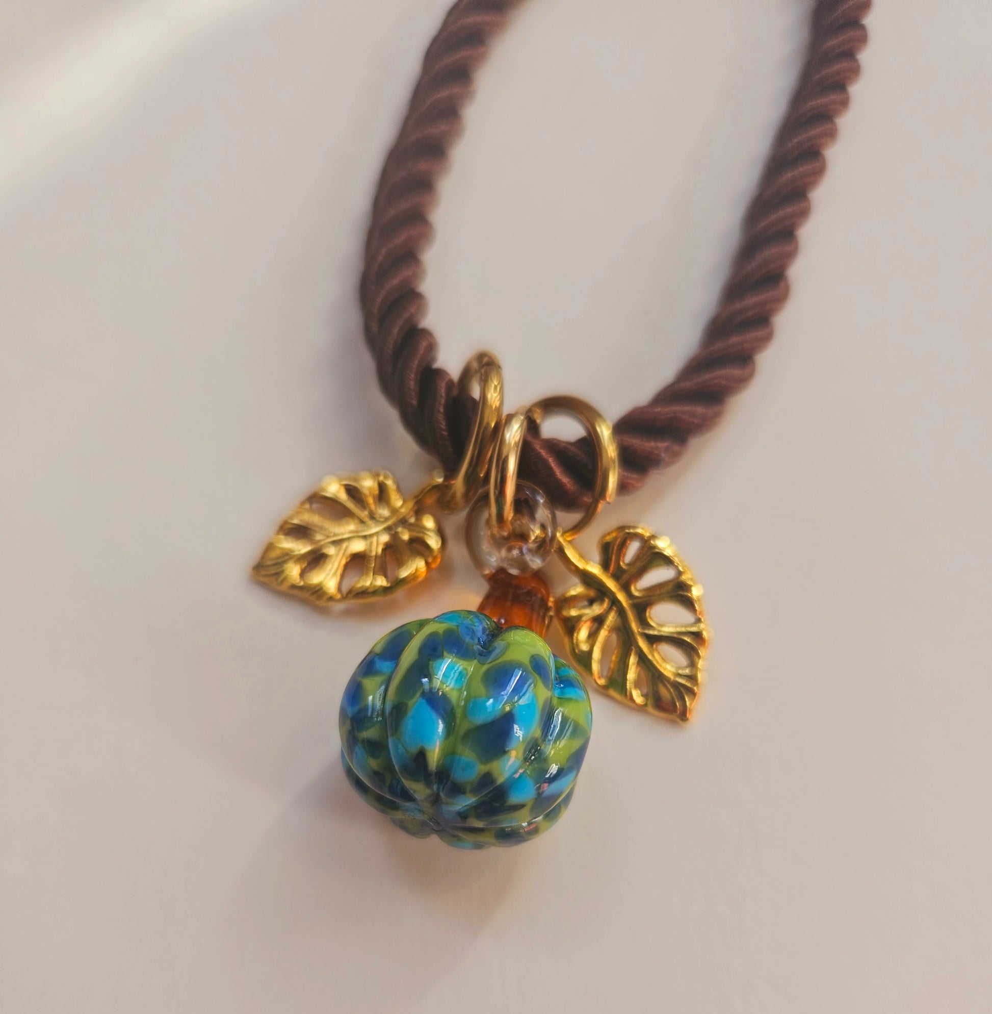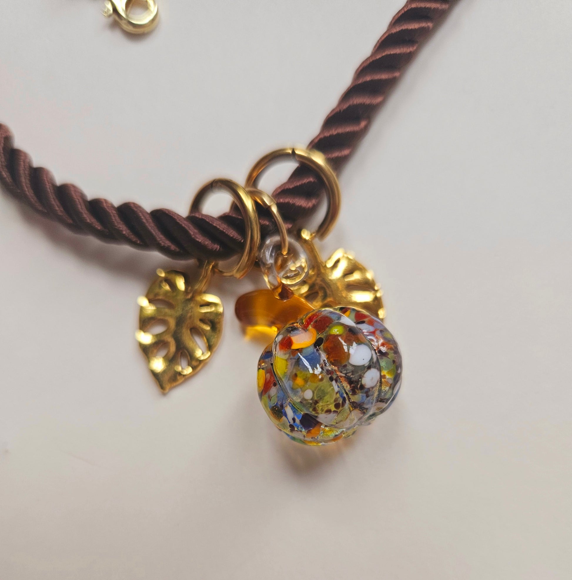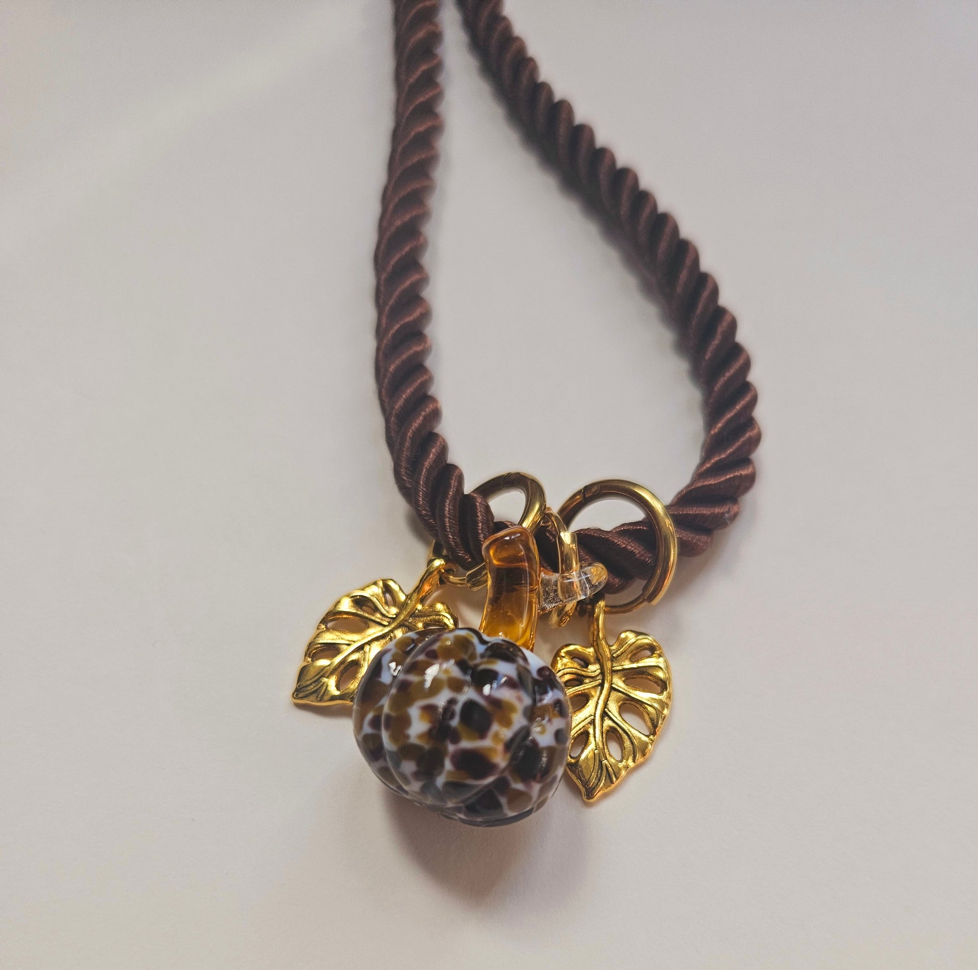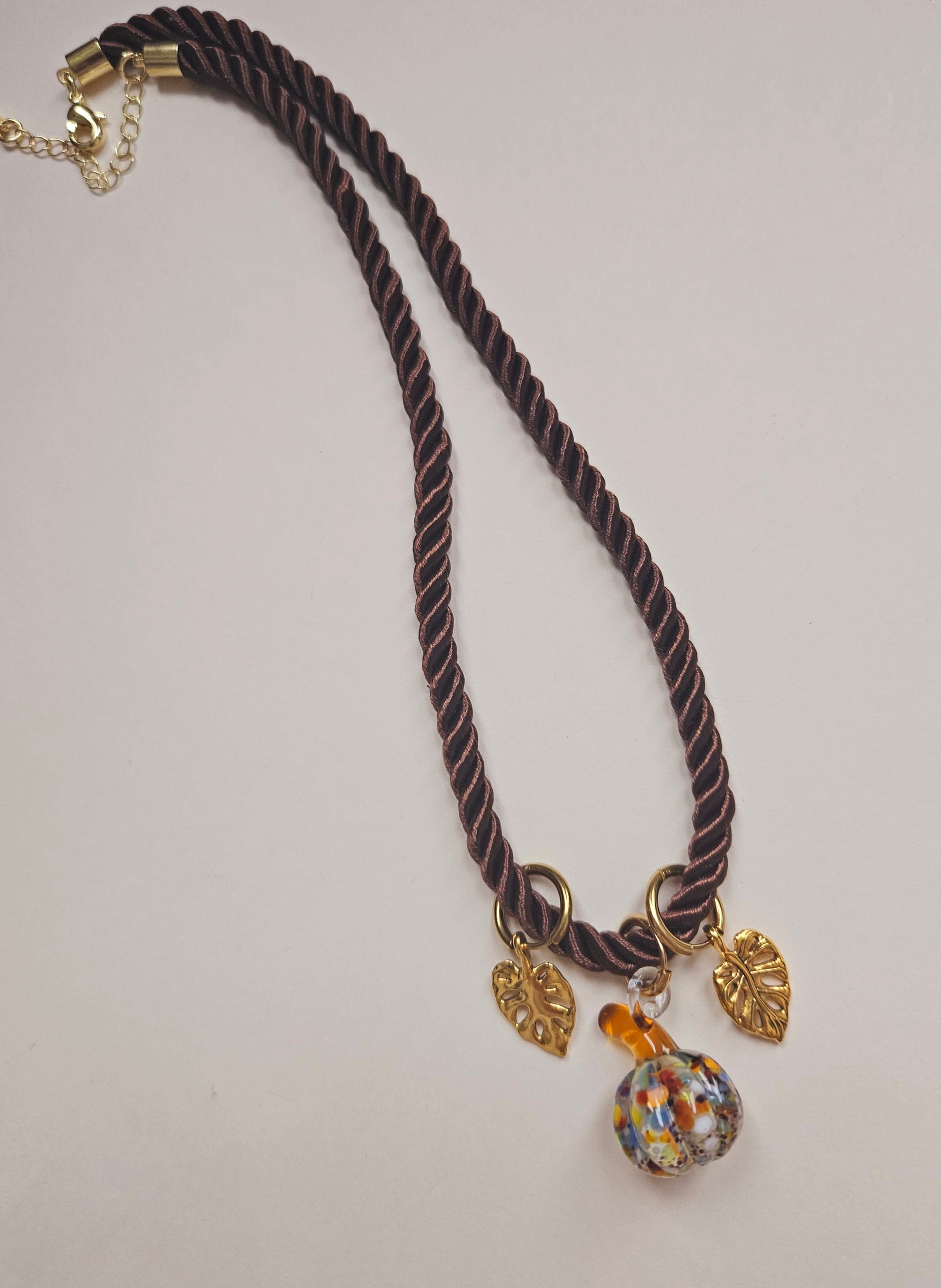Brown silk rope with a glass multicolour pumpkin pendant, and 2 monstera gold plated leaf pendants.