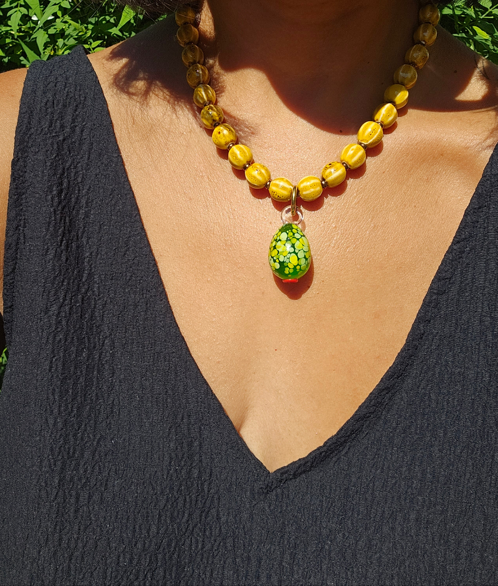 Vintage yellow ceramic beads, hematite and a glass olive pendant.