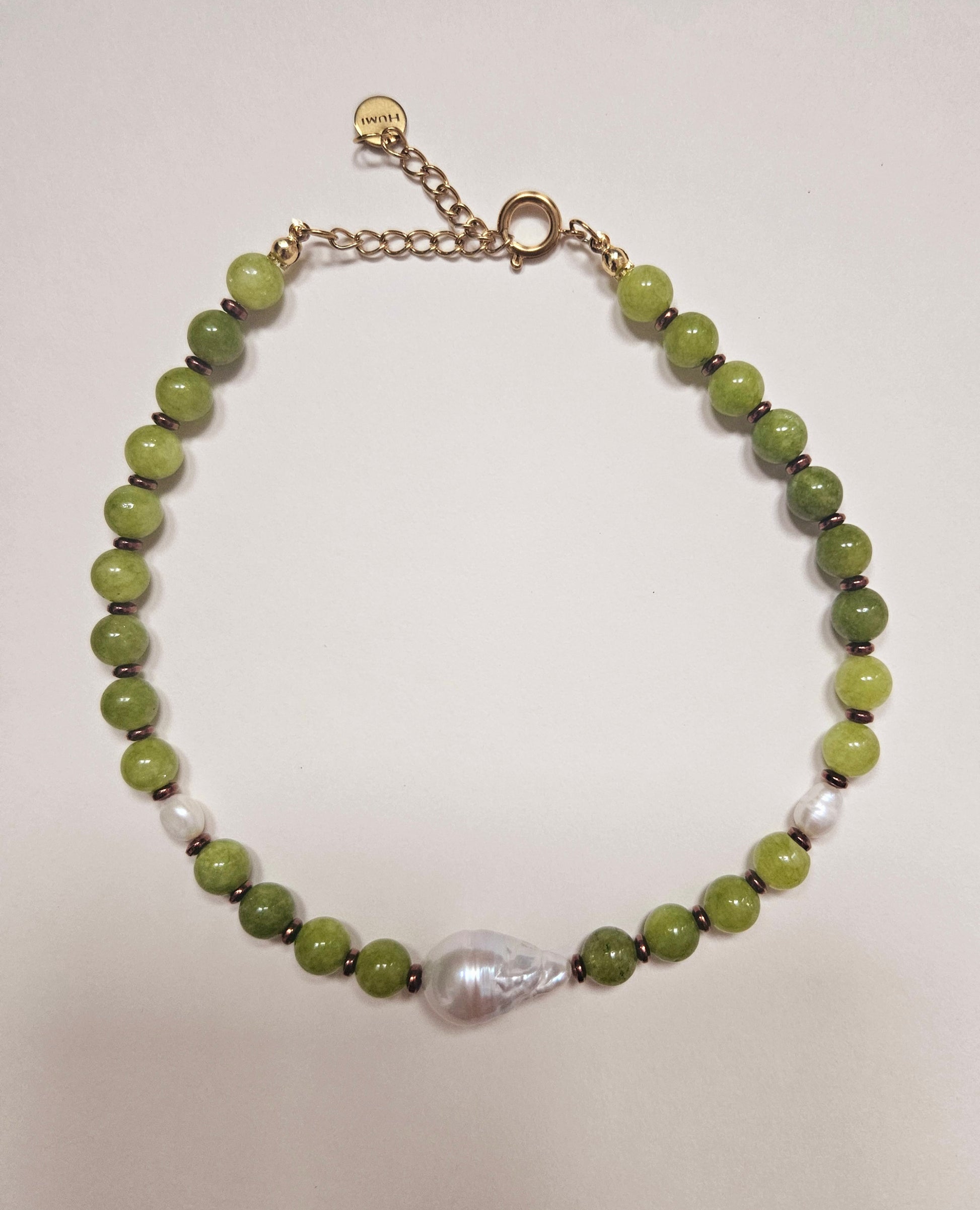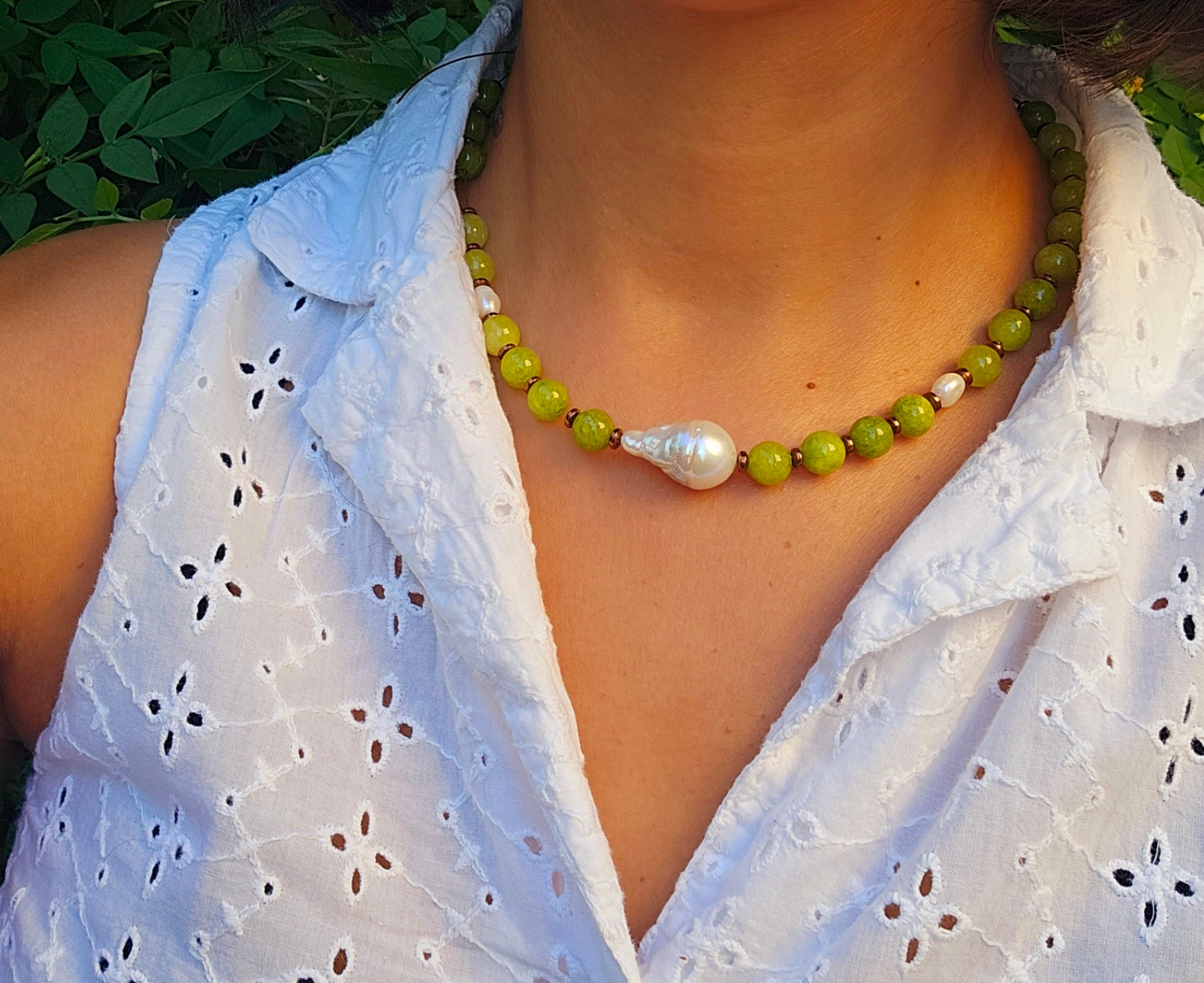 Peridot, hematite and pearl beaded necklace.