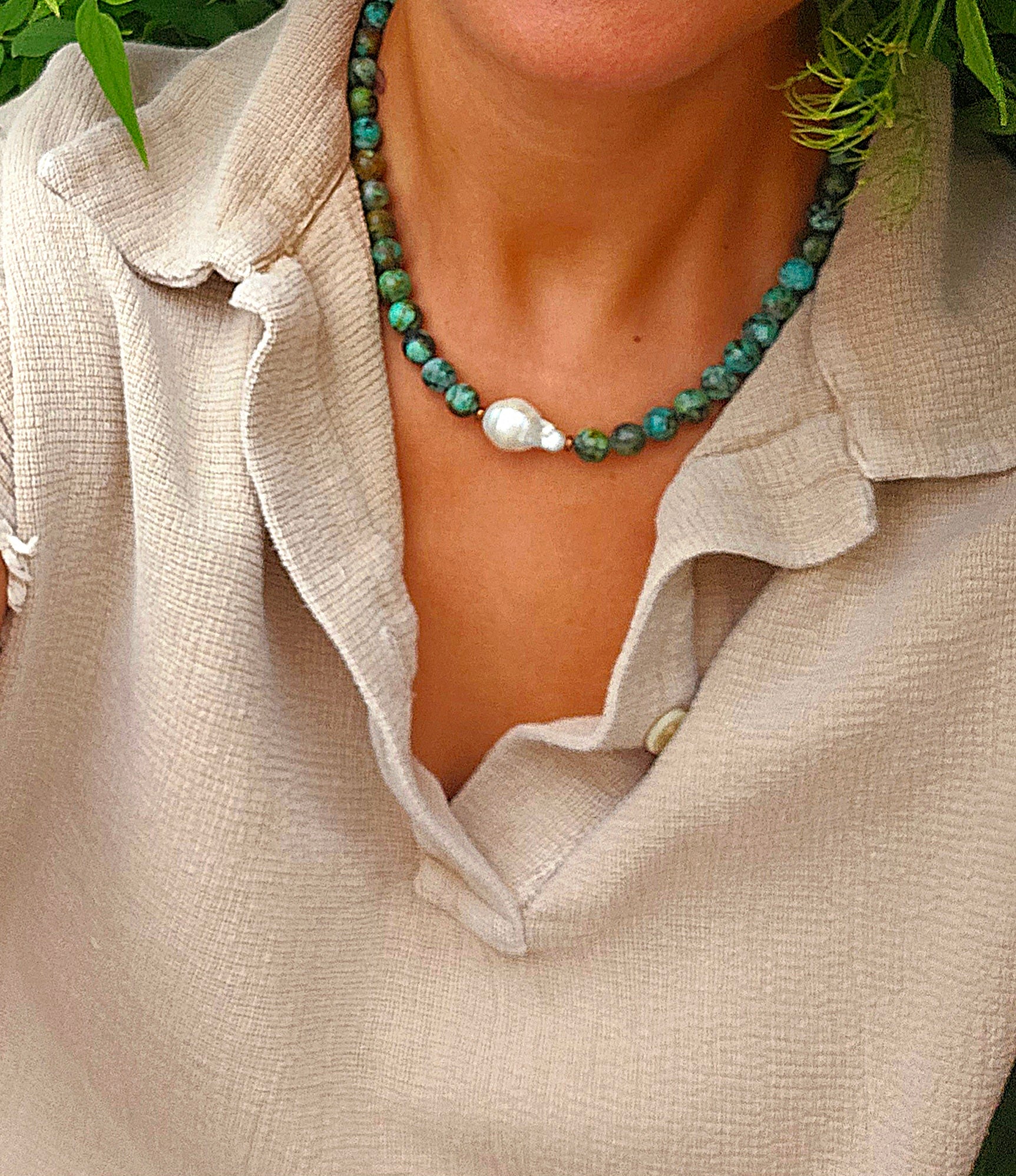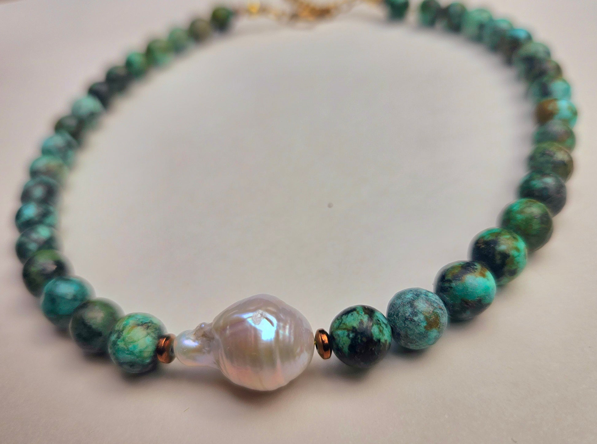 African turquoise stone beads with a baroque pearl. All gold filled hardware.